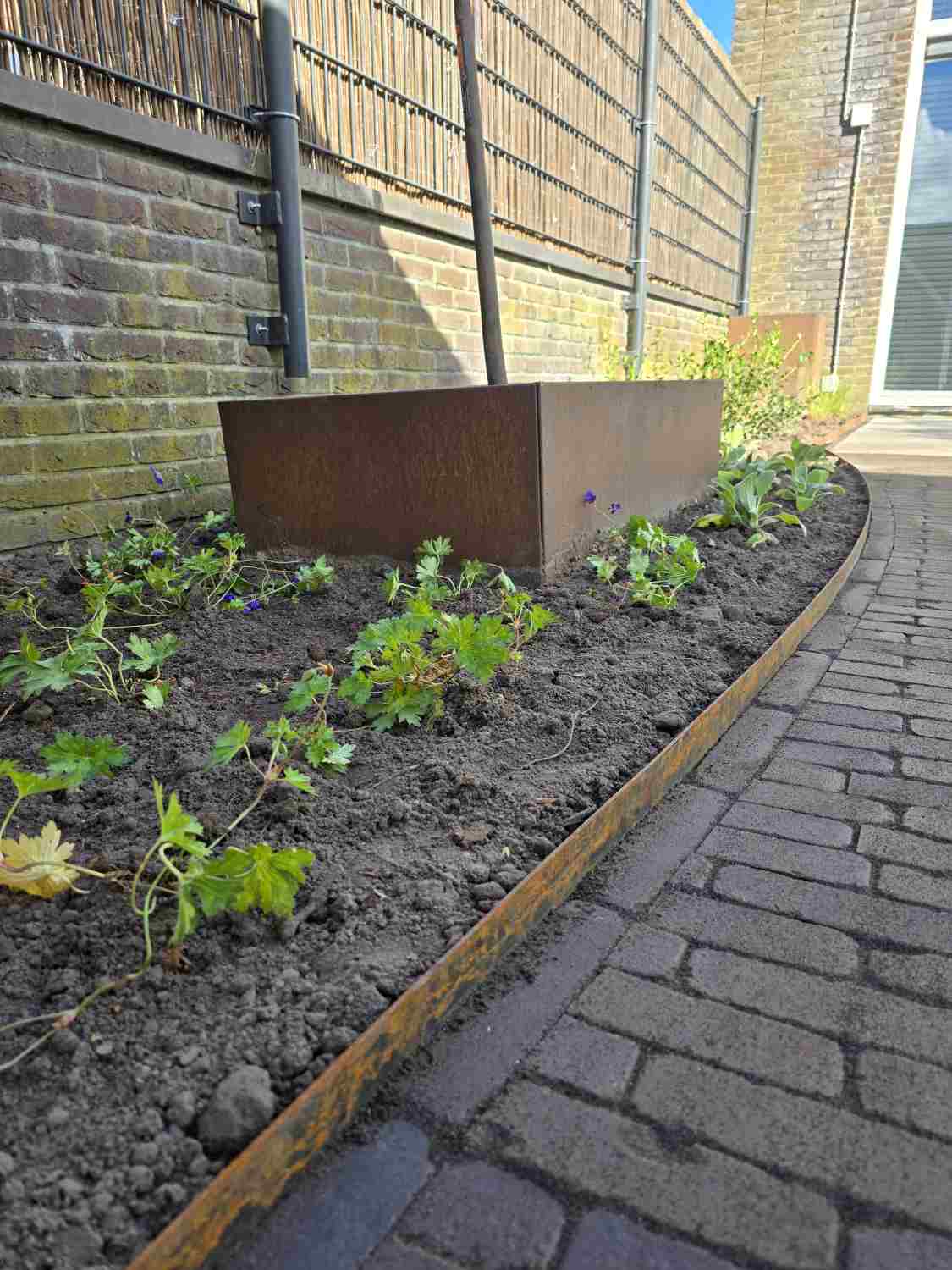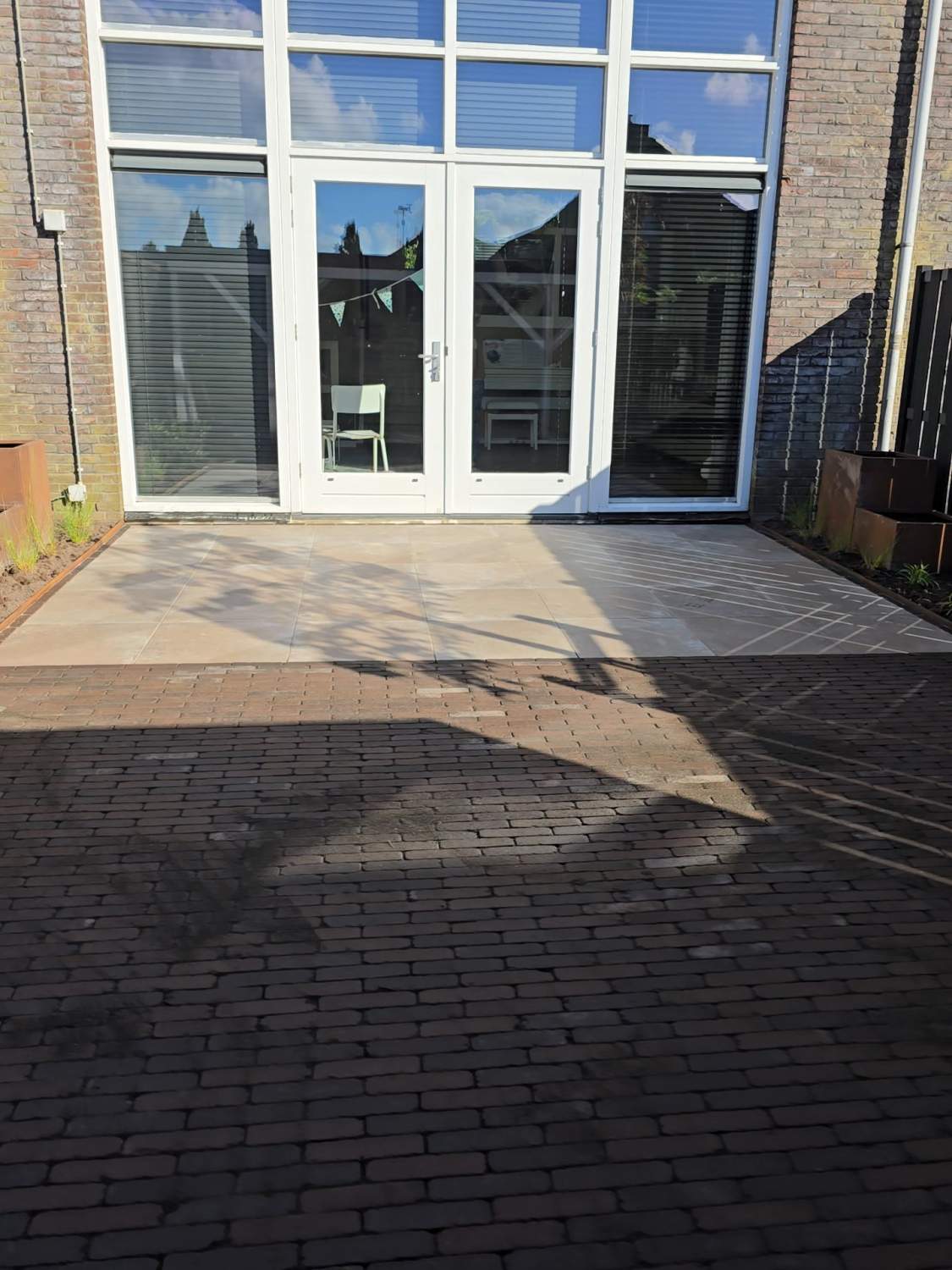 In de achtertuin is gekozen voor keramische tegels in combinatie met voegmiddel, wat zorgt voor een rustige en moderne uitstraling. Het pad van waalformaat gebakken klinkers brengt warmte en karakter in de tuin, terwijl de cortenstalen borderranden een modern accent toevoegen dat alle elementen met elkaar verbindt.